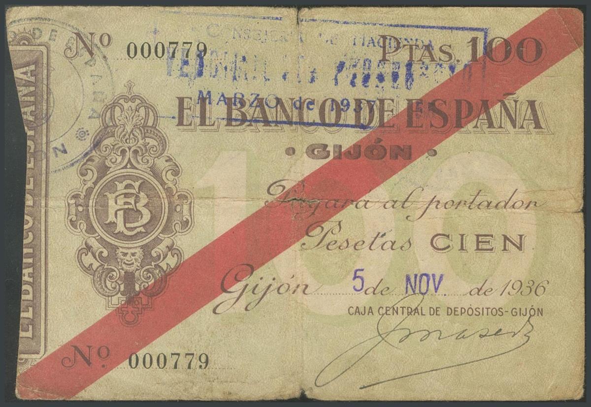 100 Pesetas. November 5, 1937. Bank of Spain, Gijón branch. No serie. (Edifil 2017: 384). G.