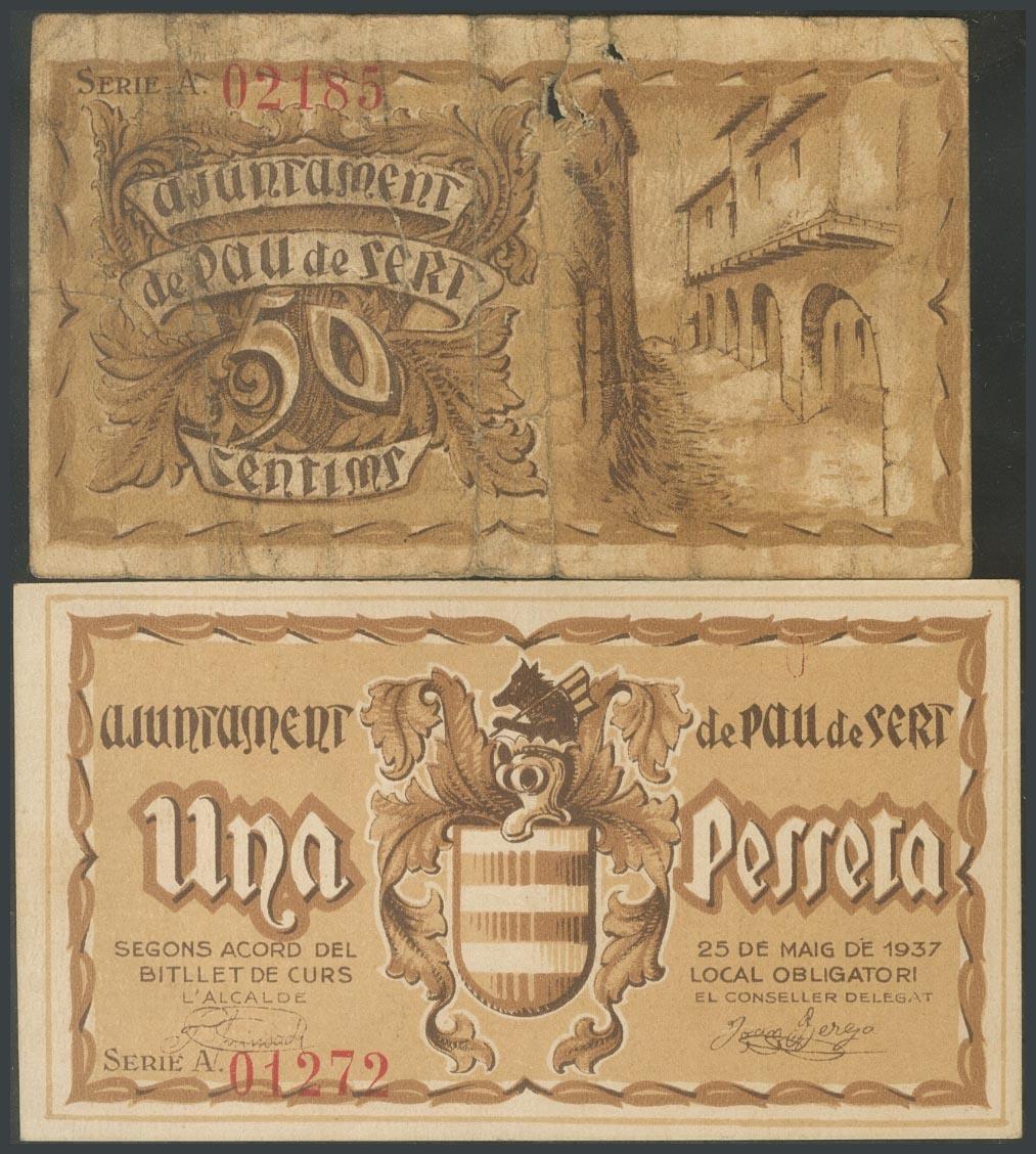 PAU DE SERT (GERONA). 50 Cents and 1 Peseta. May 25, 1937. Series A, both. (González: 9171/72). Unusual FR2/ AU.