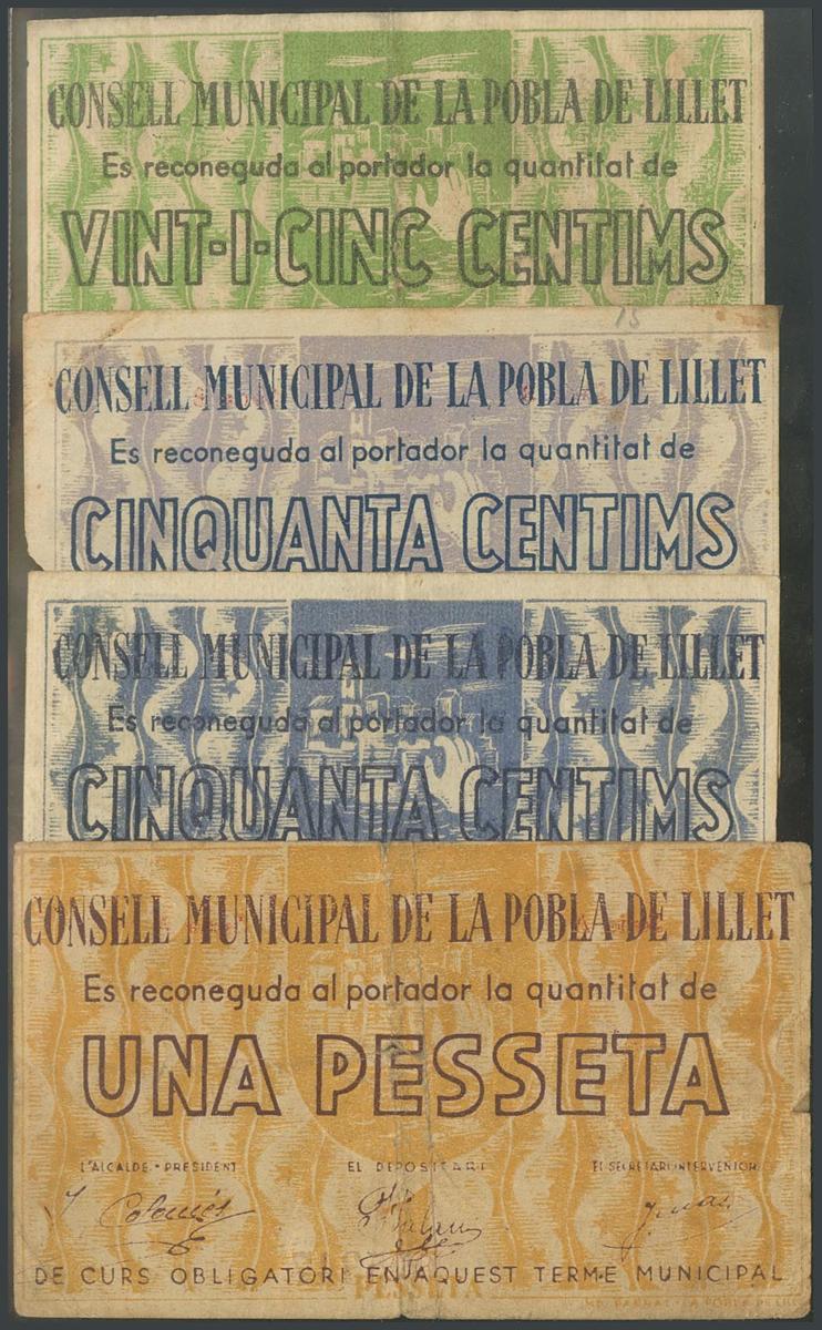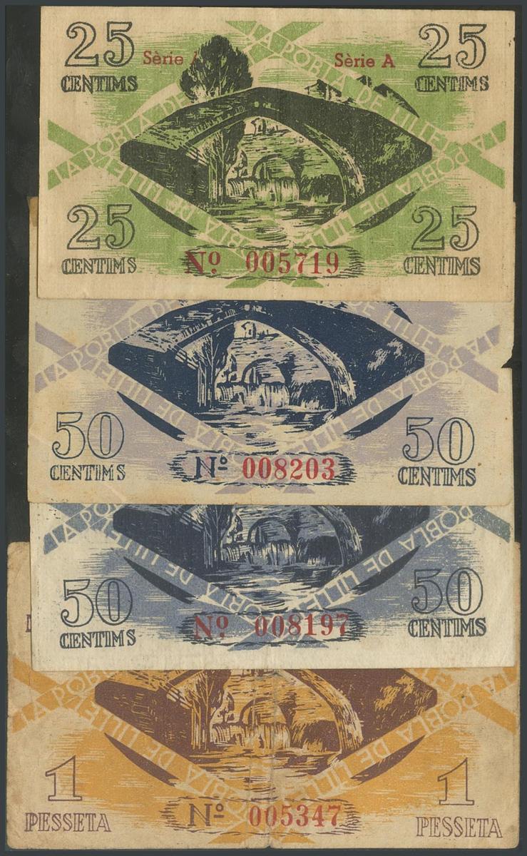 English POBLA DE LILLET (BARCELONA). 25 Cents, 50 Cents (series A and B) and 1 Peseta (series A). (1938ca). (González: 9317, 9318, 9319, 9320). F/ FR2.