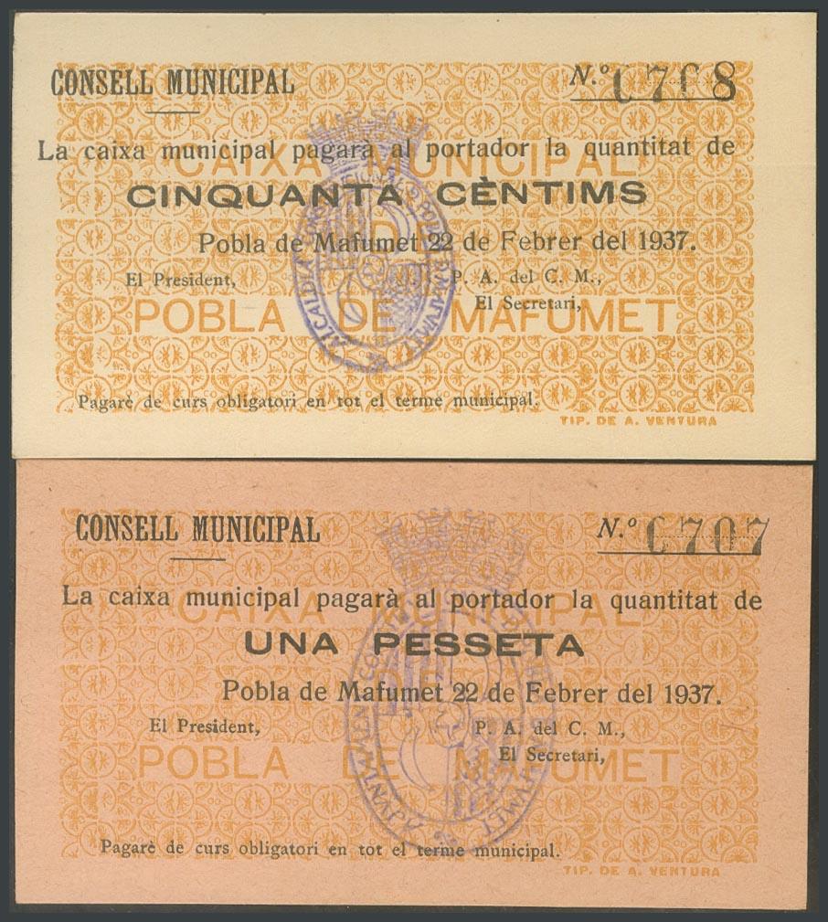 POBLE DE MAFUMET (TARRAGONA). 50 Cents and 1 Peseta. February 22, 1937. (González: 9322/23). Very rare. UNC.