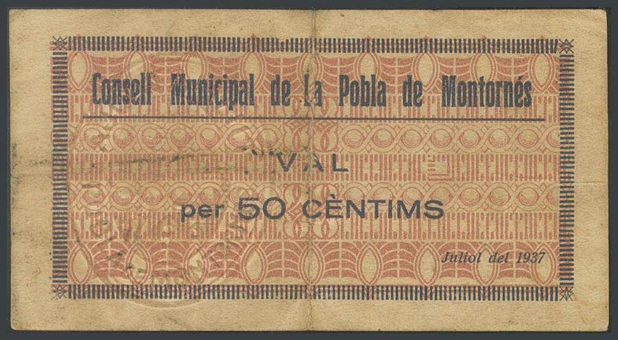 POBLA DE MONTORNES (TARRAGONA). 50 cents. July 1937. (González: 9332). Very rare. BC +.