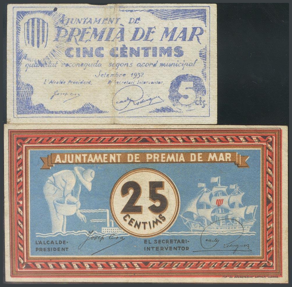 PREMIA DEL MAR (BARCELONA). 5 Cents and 25 Cents. September 1937. Series D. (González: 9467, 9468). VF/ F.