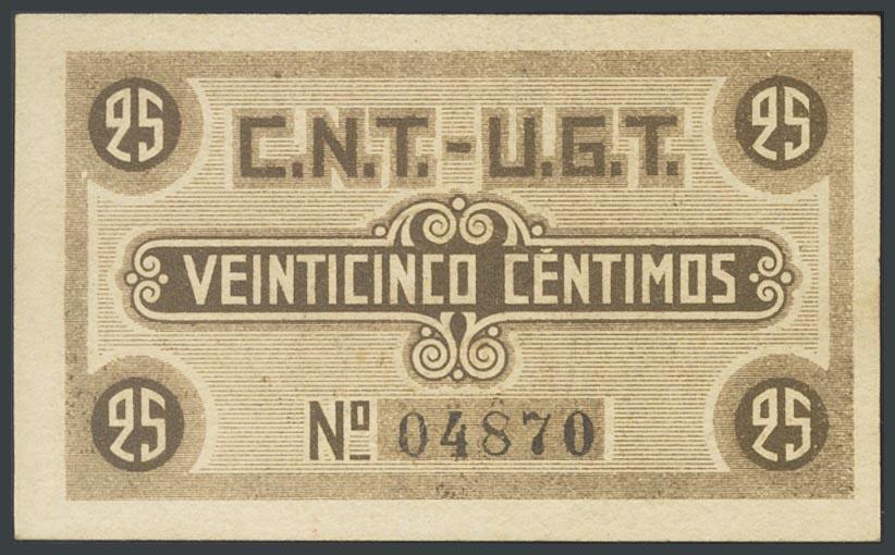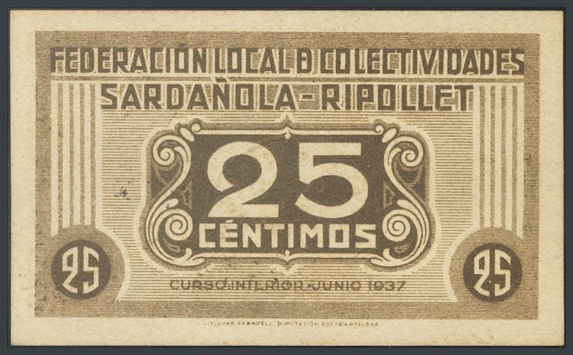 English SARDAÑOLA-RIPOLLET (BARCELONA). 25 cents. June 1937. (González: 9872). AU.
