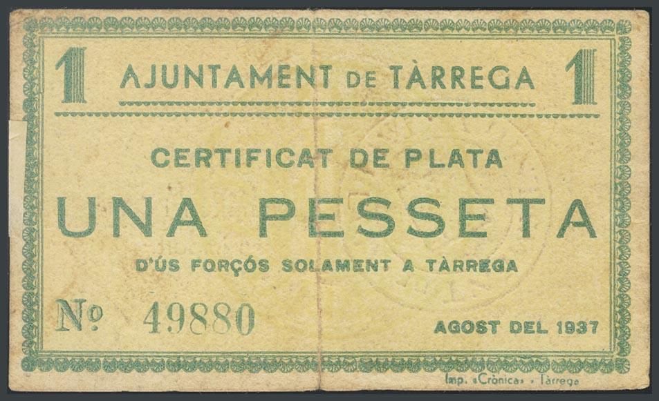 TARREGA (LERIDA). 1 peseta. August 1937. (González: 10099). F.