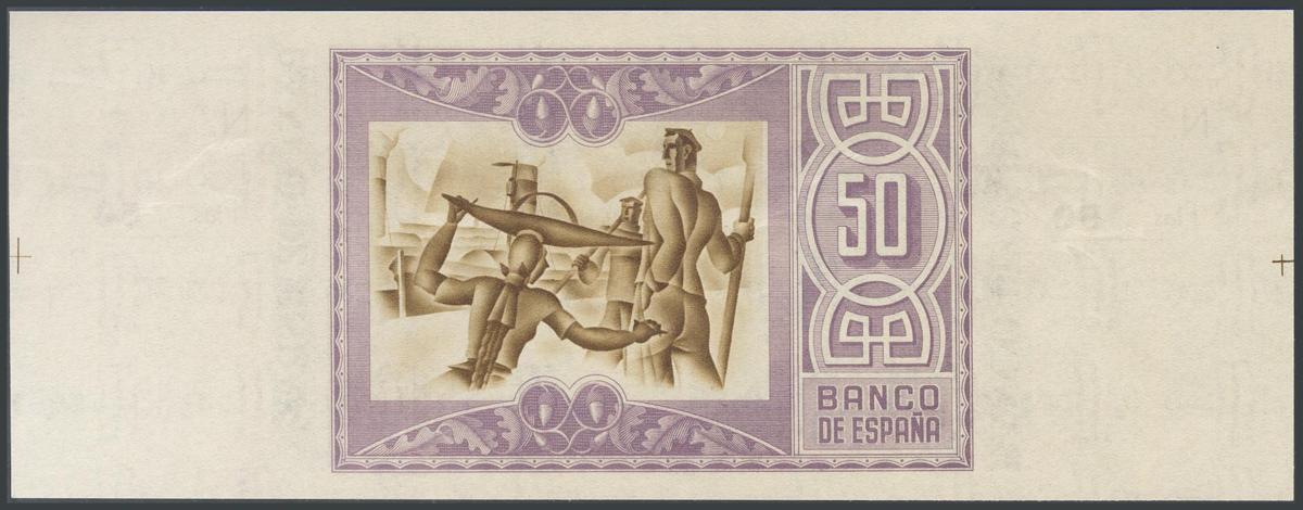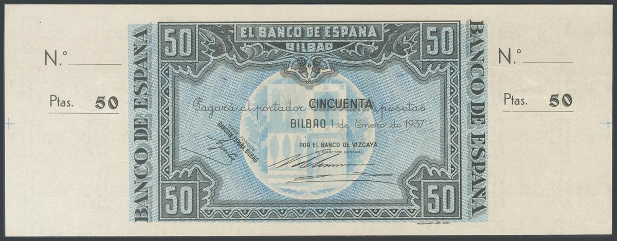 50 Pesetas. January 1, 1937. Bilbao branch, signed by Banco de Vizcaya. Without series and without numbering, with both matrices. (Edifil 2017: 389b). UNC.