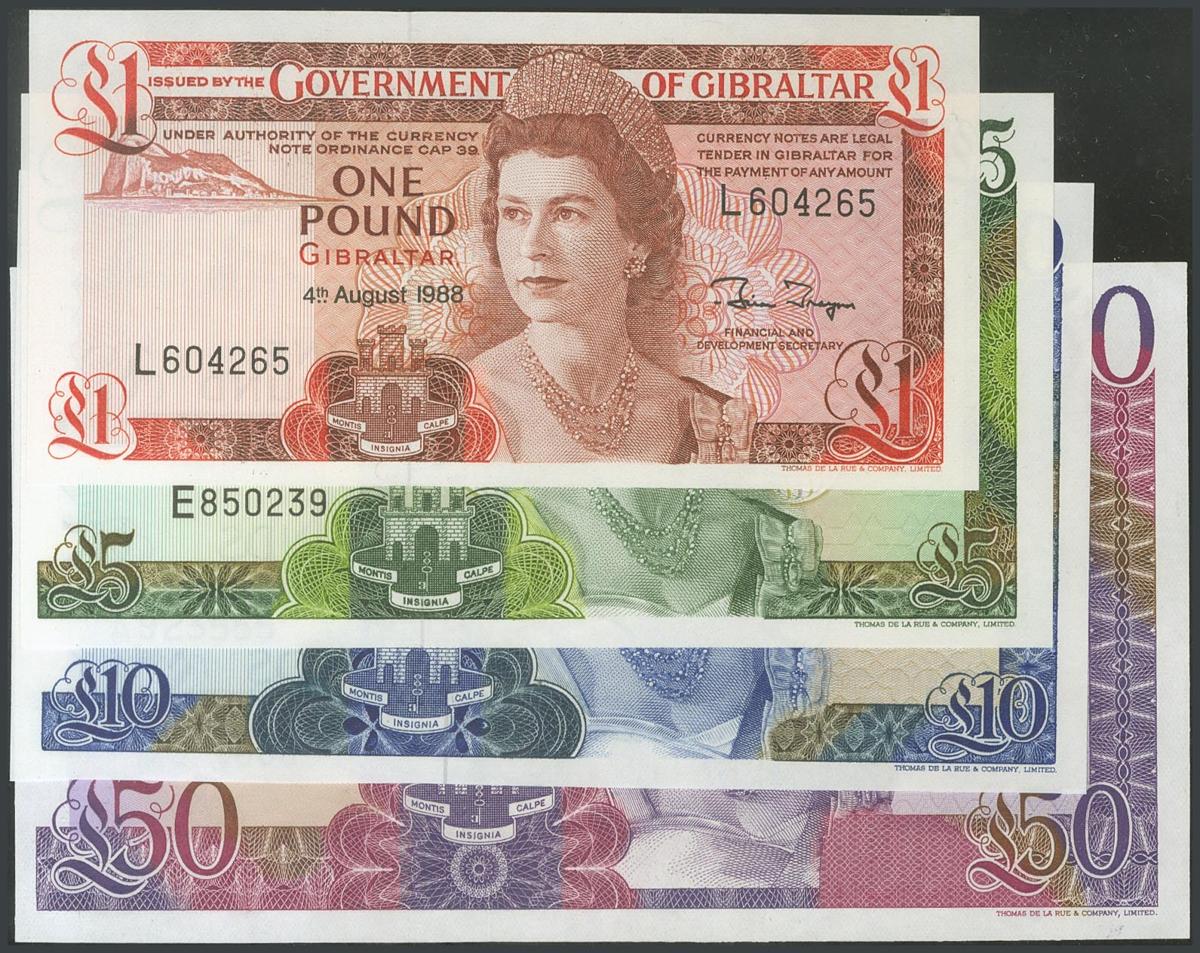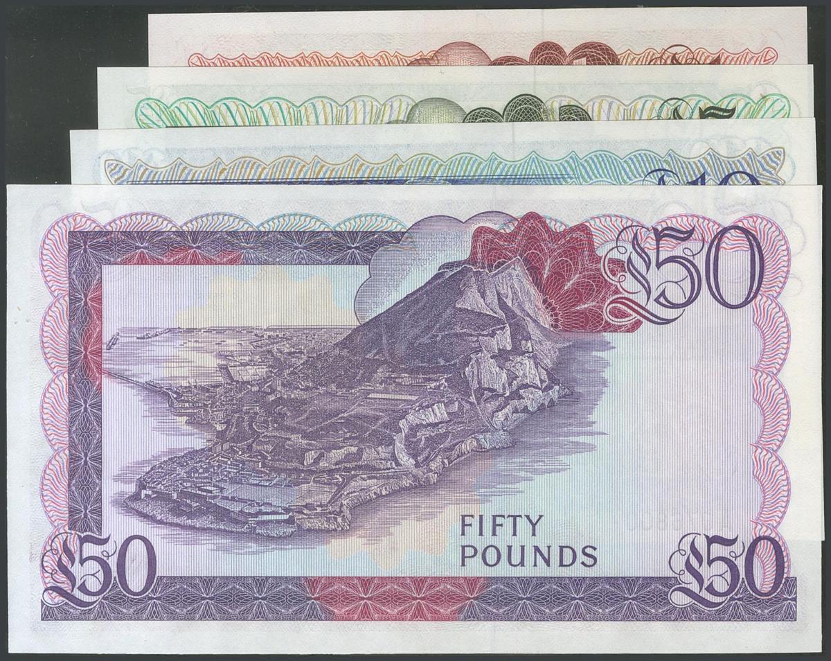 English GIBRALTAR. 1 Pound, 5 Pounds, 10 Pounds and 50 Pounds. (Pick: 20, 21, 22, 24). About Uncirculated / Uncirculated