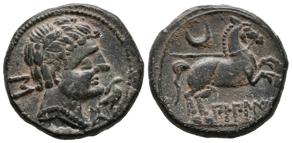 BILBILIS (Calatayud, Zaragoza). Semis. (Ae. 7.00g / 21mm). 120-30 BC Anv: Male head to the right, behind Iberian letter S, in front of dolphin. Rev: Horse jumping to the right, above crescent, below Iberian legend: BiLBiLIS. (FAB-266). VF. Reduced fields.