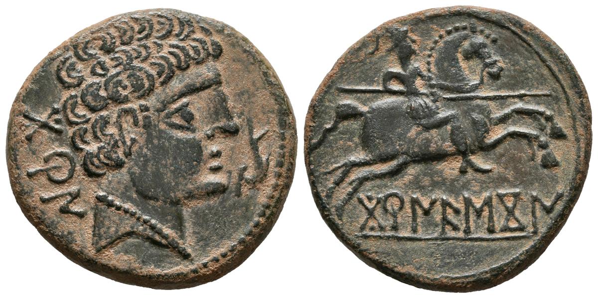 BORNESCON (Area of Aragon). As. (Ae. 9.03g / 25mm). 120-80 BC Anv: Male head to the right, behind Iberian letters: BoRN, in front of the dolphin. Rev: Rider with spear to the right, below Iberian legend: BoRNESCoN. (FAB-292). VF. Outlined bust and rider.