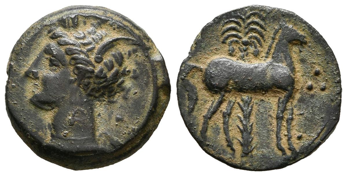 CARTAGONOVA (Cartagena, Murcia). 1/2 Tracing. (Ae. 2.78g / 17mm). 220-215 BC Anv: Head of Tanit to the left. Rev: Horse standing to the right, behind palm tree, in front of three points. (FAB-507 var). VF. Added land.