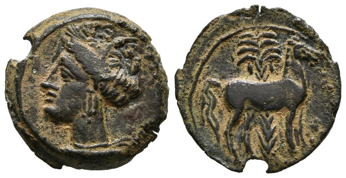 CARTAGONOVA (Cartagena, Murcia). 1/2 Tracing. (Ae. 2.78g / 17mm). 220-215 BC Anv: Head of Tanit to the left. Rev: Horse standing to the right, behind palm tree. (FAB-507). VF. Cleaned and dirt added.