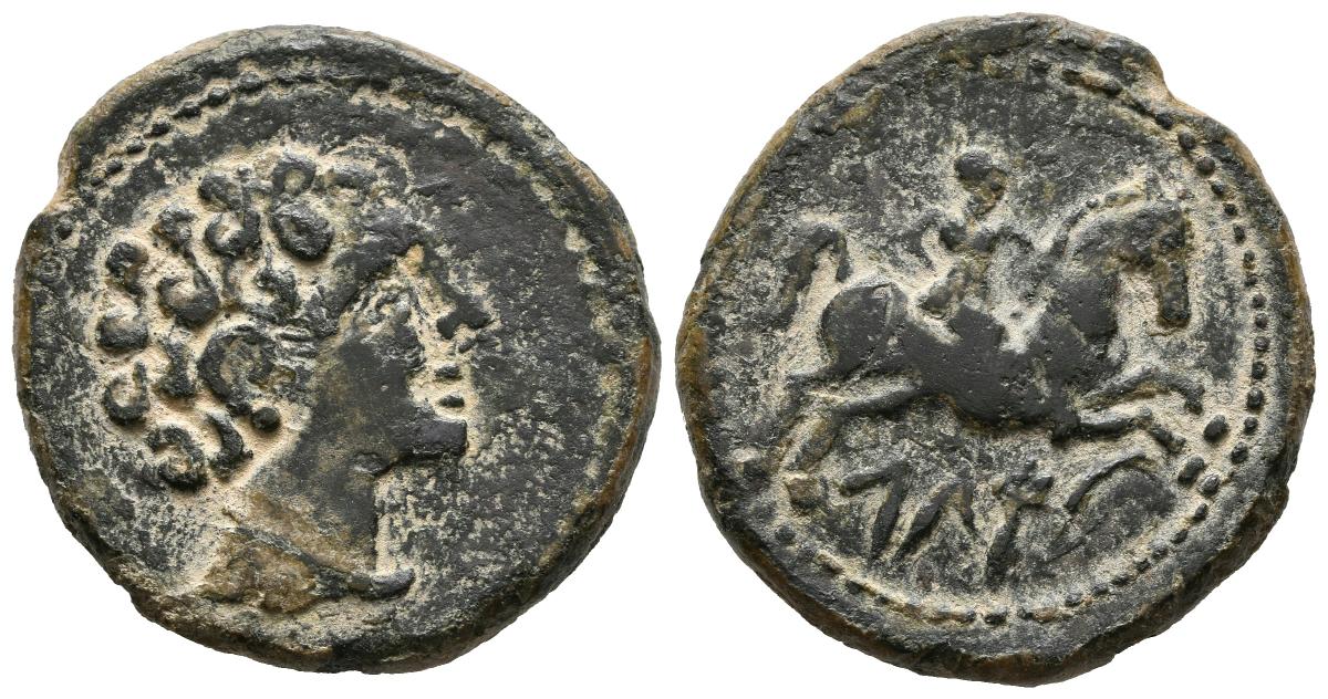 OLONT (Aznalcázar, Seville). As. (Ae. 11.79g / 27mm). 50-20 BC Anv: Male head to the right. Rev: Rider with spear to the right, below Iberian legend: OLVNT. (FAB-1874). VF. Reduced fields. Limited.