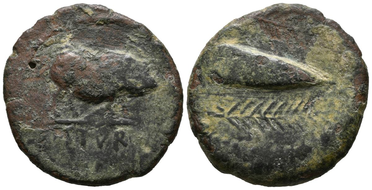 English OSTUR (Carmona, Seville). As. (Ae. 12.03g / 30mm). 150-50 BC Anv: Wild boar on the right, below legend: OSTVR. Rev: Acorn between two palms on the right. (FAB-1973). BC +.