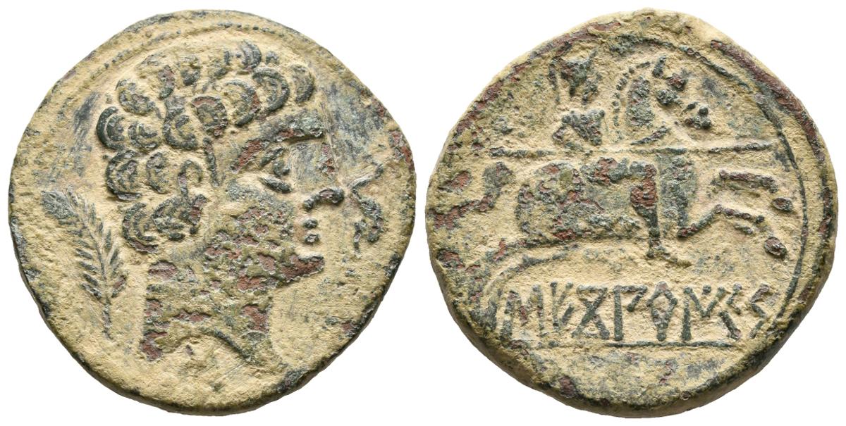 SECOBIRICES (Saelices, Cuenca). As. (Ae. 9.19g / 26mm). 120-30 BC Anv: Male head to the right, in front of the dolphin, behind the palm and below the Iberian letter S. Rev: Horseman with lance to the right, below the Iberian legend: SECoBiRICES. (FAB-2176). F.