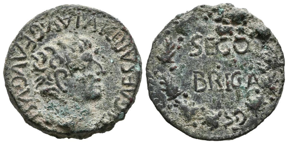 SEGOBRIGA (Saelices, Cuenca). Semis. (Ae. 5.82g / 21mm). 14-36 AD Anv: Head of Tiberius on the right, around legend: TI. CAESAR. DIVI. AVG. F. AVGVS. F. IMP. Rev: Legend: SEGOBRIGA, within laurea. (FAB-2190). F.