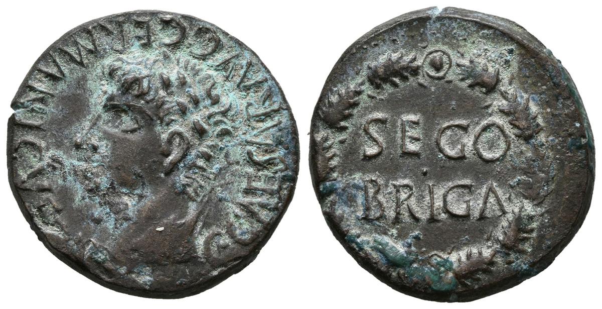 SEGOBRIGA (Saelices, Cuenca). Semis. (Ae. 5.17g / 22mm). 37-14 AD Anv: Laureate head of Caligula on the left, around legend: C. CAESAR. AVG. GERMANICVS. IMP. Rev: Legend: SEGOBRIGA, within laurea. (FAB-2192). F. Reduced and repatinate fields.