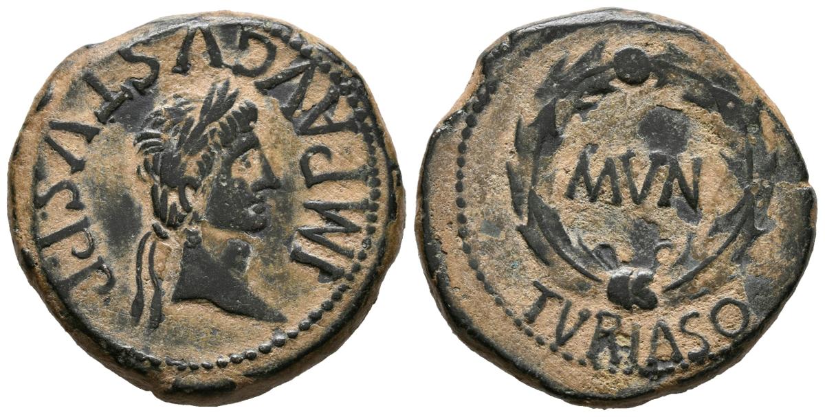 TURIASO (Tarazona, Zaragoza). As. (Ae. 12.51g / 27mm). 27 BC-AD 14 Anv: Lined head of Augsutus on the right, around legend: IMP. AVGVSTVS. PP Rev: MVN inside laurea, below legend: TVRIASO. (FAB-2437). VF.