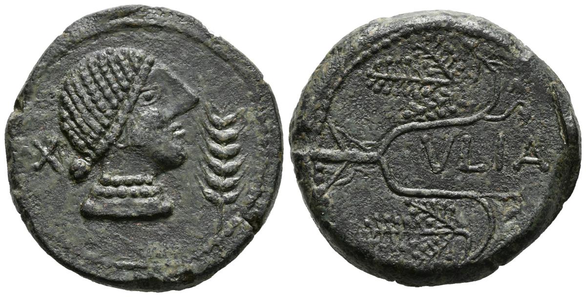 ULIA (Montemayor, Córdoba). As. (Ae. 22.63g / 31mm). 50 BC Anv: Female head to the right, front ear, behind Iberian letter Ta. Rev: Vine branches, placard with legend VLIA. (FAB-2494). VF.
