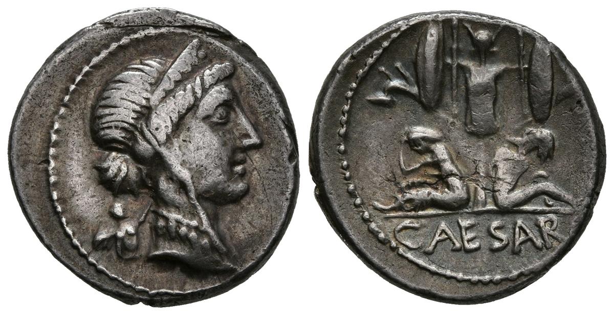 English JULIUS CAESAR. Denarius. (Ar. 3.92g / 19mm). 48-47 BC Mobile military mint with Caesar. Anv: Diademic head of Venus to right, behind Cupid. Rev: Gallic arms trophy between Galia seated on the left and Vercingetorix captive on the right, in exergue: CAESAR. (Crawford 468/1; FFC 11). F. Rare.