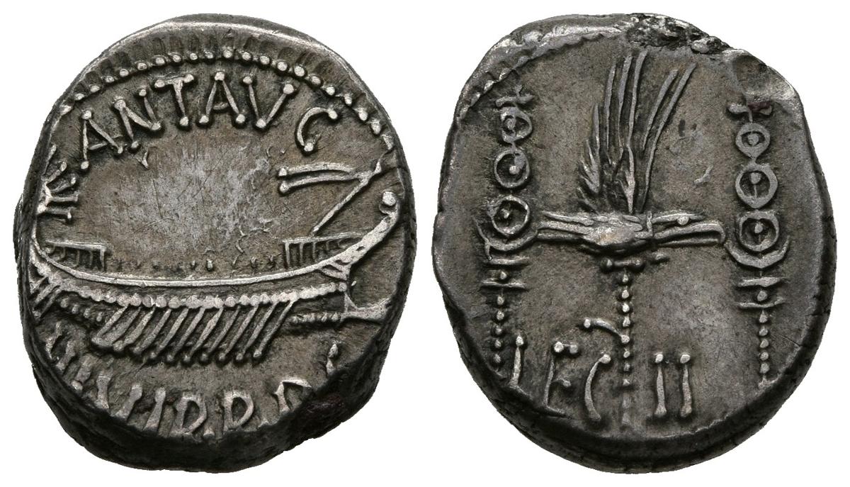 English MARCO ANTONIO. Denarius. (Ar. 3.67g / 17mm). 32-31 BC Mobile mint. Anv: ANT AVG III VIR RPC. Praetorian galley on the right. Rev: Legionary eagle between two banners, between the eagle legend: LEG II. (Crawford 544/14; FFC 32). XF. Scarce as well.