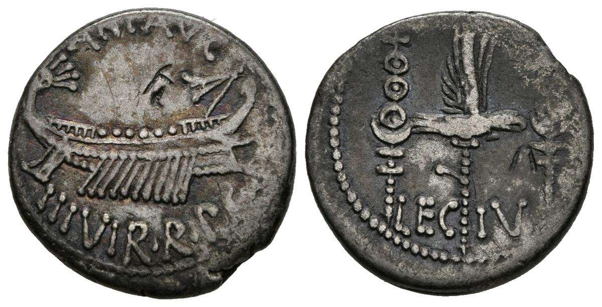 MARCO ANTONIO. Denarius. (Ar. 3.54g / 17mm). 32-31 BC Mobile mint. Anv: ANT AVG III VIR RPC. Praetorian galley on the right. Rev: Legionary eagle between two banners, between the eagle legend: LEG IV. (Crawford 544/17; FFC 35). VG.