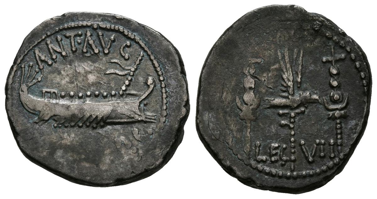 English MARCO ANTONIO. Denarius. (Ar. 3.59g / 19mm). 32-31 BC Mobile mint. Anv: ANT AVG III VIR RPC. Praetorian galley on the right. Rev: Legionary eagle between two banners, between the eagle legend: LEG VII. (Crawford 544/20; FFC 38). F.