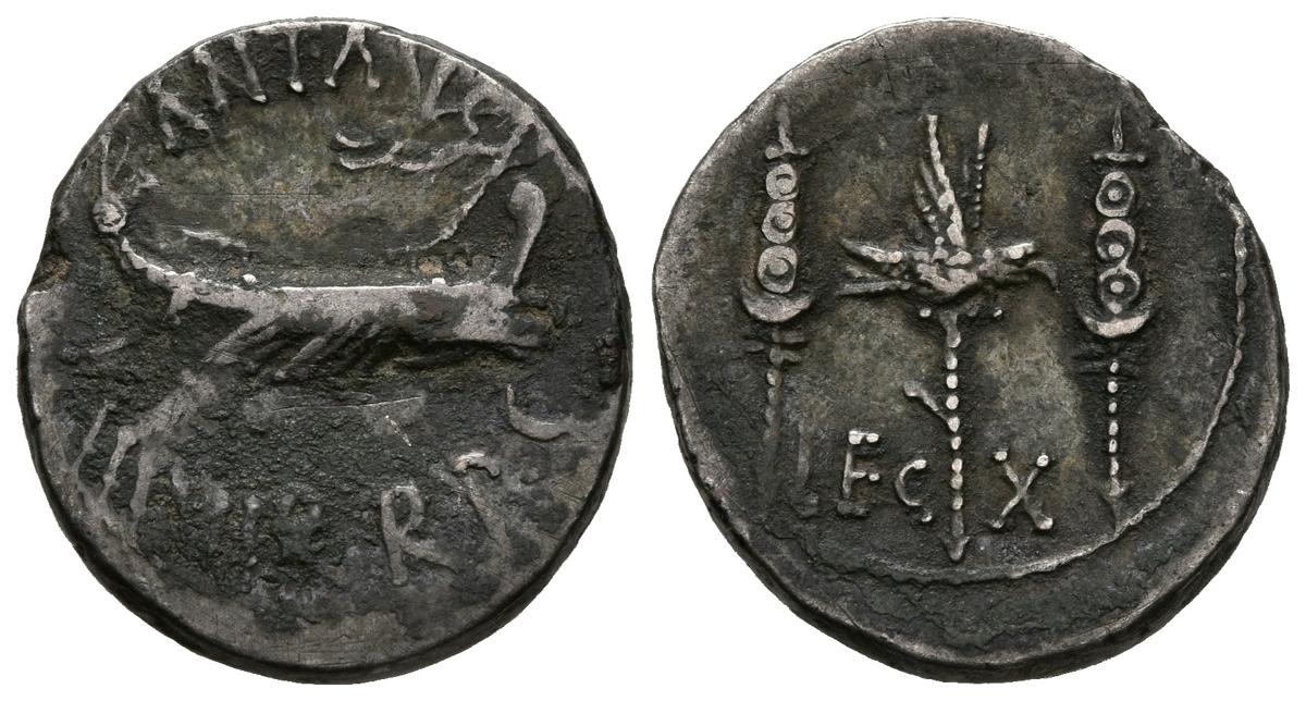 MARCO ANTONIO. Denarius. (Ar. 3.26g / 19mm). 32-31 BC Mobile mint. Anv: ANT AVG III VIR RPC. Praetorian galley on the right. Rev: Legionary eagle between two banners, between the eagle legend: LEG X. (Crawford 544/24; FFC 43). F.