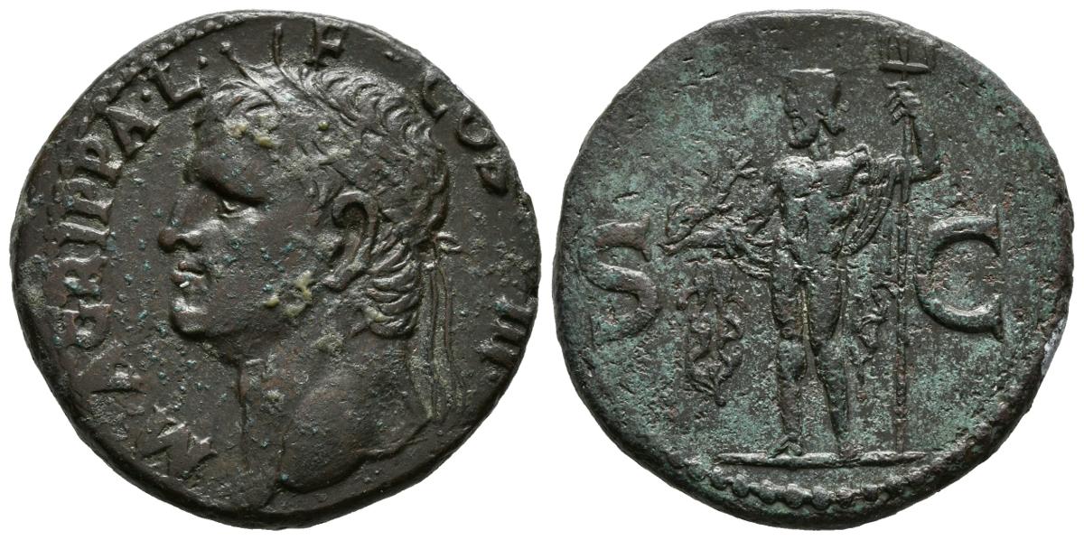 English AGRIPPA. As. (Ae. 10.70g / 27mm). 37-41 AD Rome. Anv: M AGRIPPA LF COS III. Bust with rostral crown to the left of Agrippa. Rev: Neptune left shelf carrying trident and dolphin holding mantle, between UNC. (RIC 58). F.