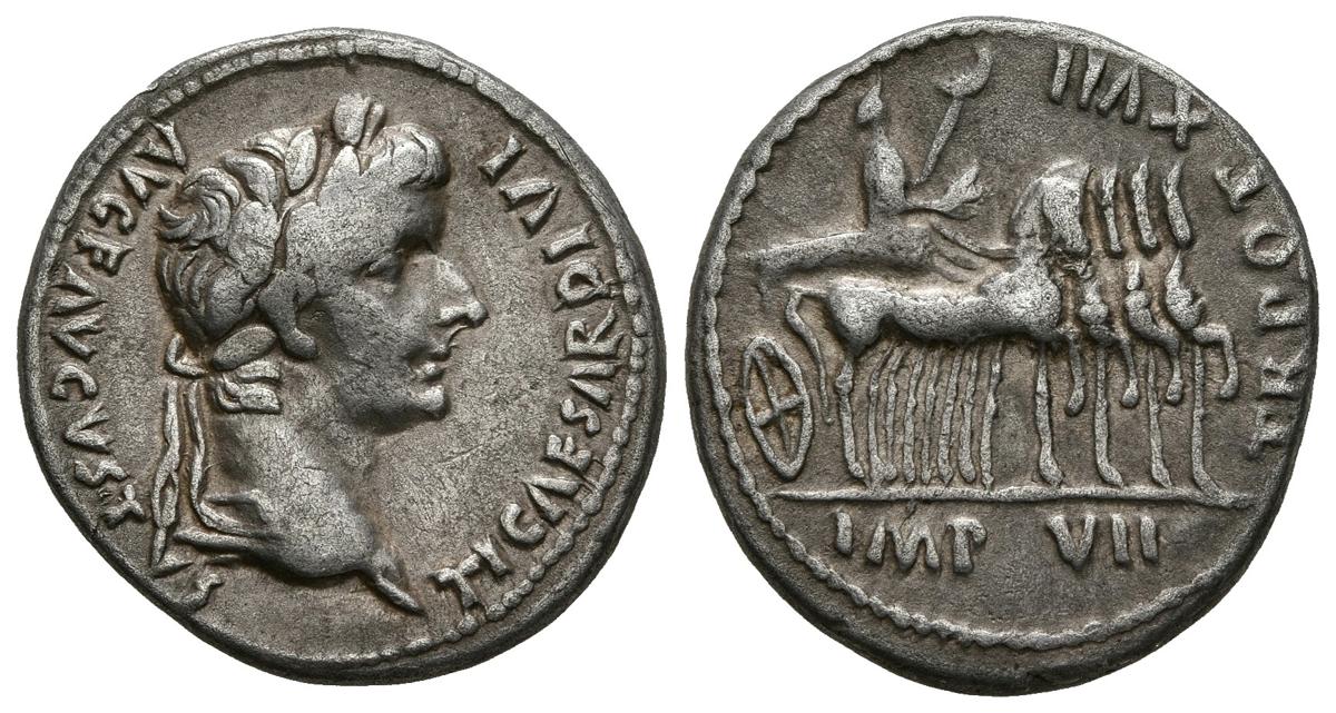 English TIBERIUS. Denarius. (Ar. 3.78g / 19mm). 15-16 AD Lugdunum. Anv: TI CAESAR DIVI AVG F AVGVSTVS. Laureate bust to the right of Tiberius. Rev: IMP VII TR POT XVII. Tiberius holding Eagle on scepter and palm, leading chariot to the right. (RIC 4). F. Beautiful and very rare specimen.