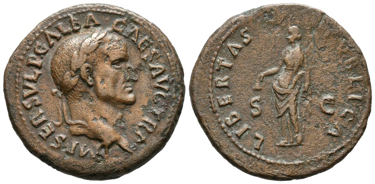 English GALBA. As. (Ae. 9.88g / 28mm). 68 AD Rome. Anv: IMP SER SVLP GALBA CAES AVG TR P. Laureate bust of Galba on the right. Rev: LIBERTAS PVBLICA. Libertas shelf to the left carrying crown and scepter. (RIC 328). VF. Retouched. Limited.