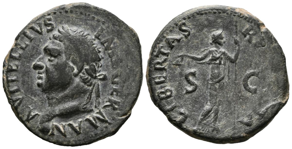 English AULUS VITELLIS. As. (Ae. 9.90g / 29mm). 69 AD Tarraco. Anv: A VITELLIVS IMP GERMAN. Vitellius laureate bust to the left. Rev: LIBERTAS PVBLICA. Libertas shelf to the right carrying crown and scepter, between UNC. (RIC 43). F. Reduced fields.