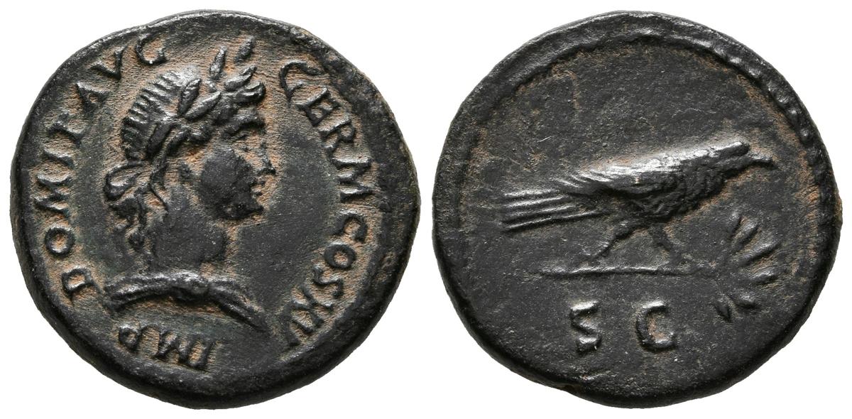 DOMITIAN. Quadrant. (Ae. 5.25g / 21mm). 90-91 AD Rome. Anv: IMP DOMIT AVG GERM COS XV. Laureate bust of Apollo on the right. Rev: Eagle on branch to right, below UNC. (RIC 715). XF. Reduced fields.