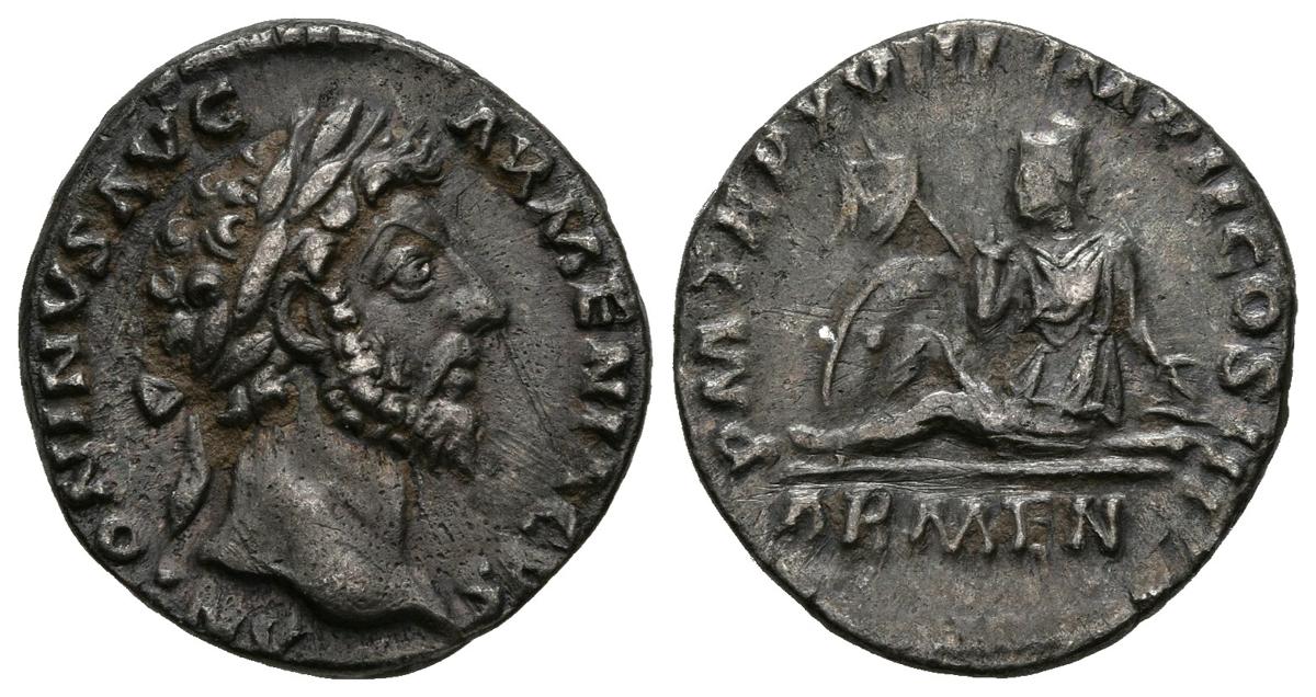 MARCUS AURELIUS. Denarius. (Ar. 3.22g / 17mm). 163-164 AD Rome. Anv: ANTONINVS AVG ARMENICVS. Laureate bust to the right of Marco Aurelio. Rev: PM TR P XVIII IMP II COS III. Armenia sitting on the ground to the left, behind the banner and shield, in exergue: ARMEN. (RIC 81). VF.