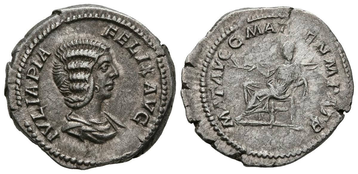 JULIA DOMNA. Denarius. (Ar. 3.94g / 20mm). 211-217 AD Rome. Anv: IVLIA PIA FELIX AVG. Bust draped to the right of Julia Domna. Rev: MAT AVGG MAT SEN M PATR. Julia Domna sitting on the left holding palm. (RIC 381). VF.