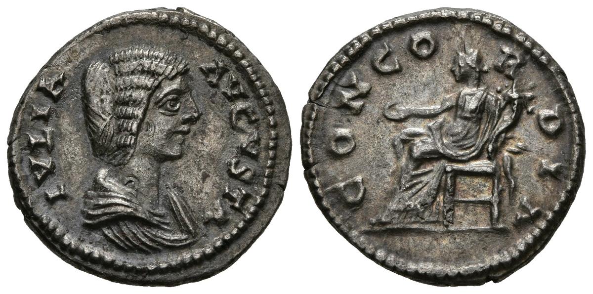 JULIA DOMNA. Denarius. (Ar. 3.23g / 19mm). 193 AD Laodicea. Anv: IVLIA AVGVSTA. Draped bust with hair gathered to the right of Julia Domna. Rev: CONCORDIA. Concordia seated left wearing pater and cornucopia. (RIC 637). VF.