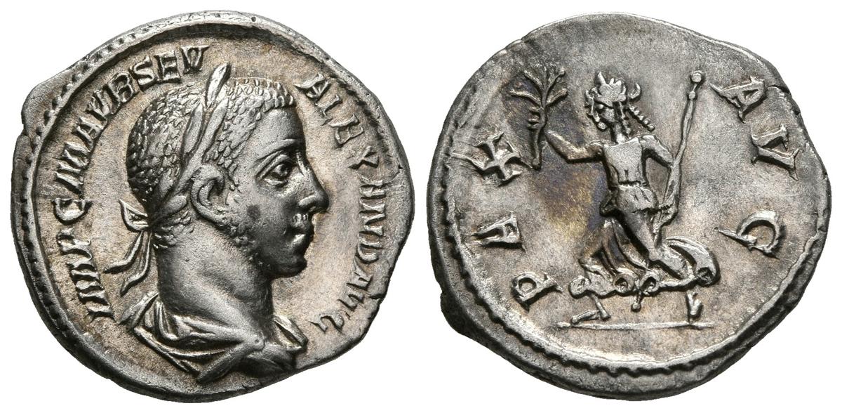 SEVERUS ALEXANDER. Denarius. (Ar. 2.64g / 19mm). 226 AD Rome. Anv: IMP CM AVR SEV ALEXAND AVG. Laureate and draped bust to the right of Alejandro Severo. Rev: PAX AVG. Pax advancing to the left carrying branch and scepter. (RIC 168). VF.