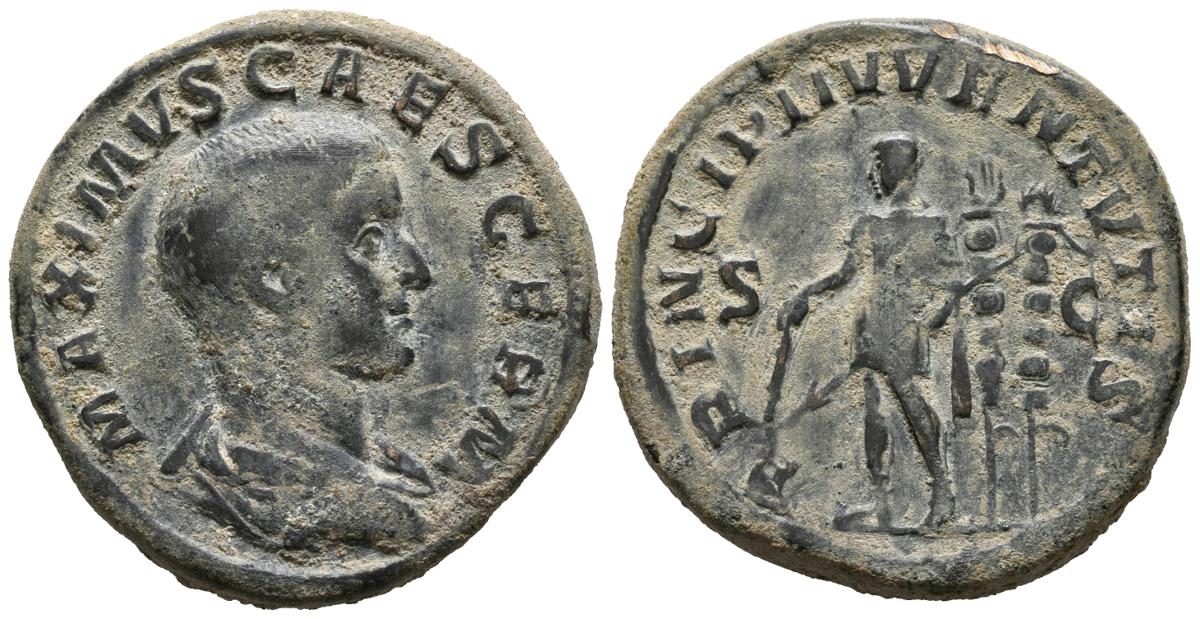 MAXIMUM. Sesterce. (Ae. 21.65g / 31mm). 236-238 AD Rome. Anv: MAXIMVS CAESAR GERM. Bust draped to the right of Máximo. Rev: PRINCIPI IVVENTVTIS. Maximum with military attire, shelf to the left, carrying staff and spear, behind two banners. (RIC 13). VG. Reduced and repatinate fields.