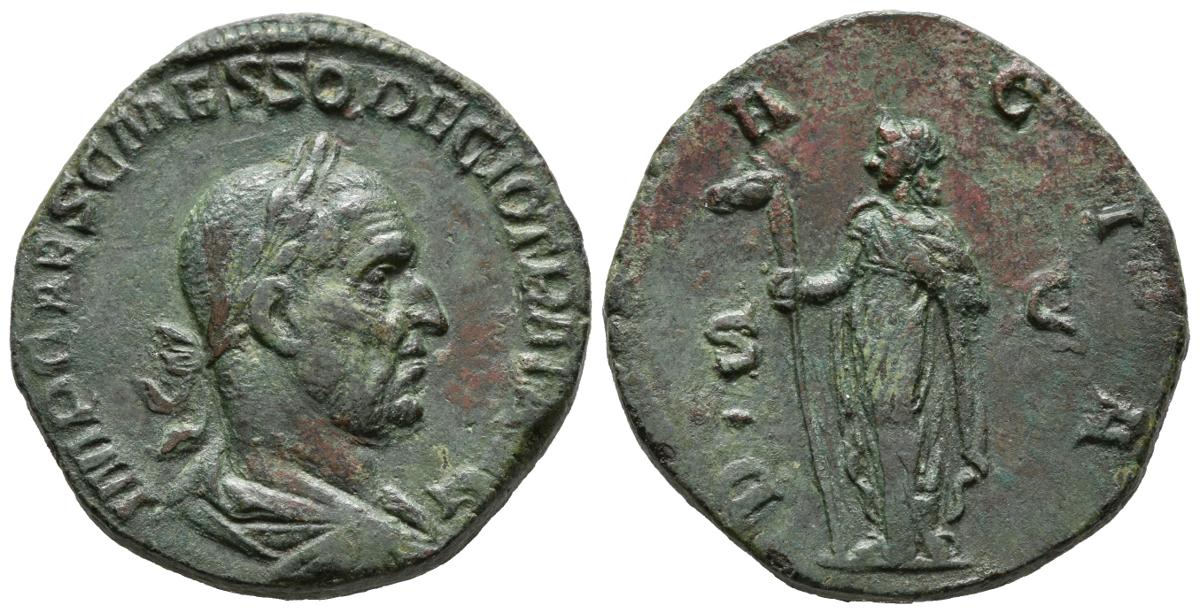 English TRAJAN DECIO. Sesterce. (Ae. 18.32g / 29mm). 249-250 AD IMP CMQ TRAIANVS DECIVS AVG. Laureate and draped bust to the right of Trajan Decius. Rev: DACIA. Dacia shelf on the left carrying a cane with an ass's head, between UNC. (RIC 112a). VF. Reduced and repatinate fields.