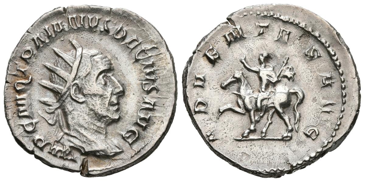 TRAJAN DECIO. Antoninian. (Ar. 3.75g / 22mm). IMP CMQ TRAIANVS DECIVS AVG. Bust radiated and draped to the right of Trajano Decio. Rev: ADVENTVS AVG. Trajan Decius in military garb raising his right hand and carrying a lance on horseback to the left. (ICR 11b). VF.