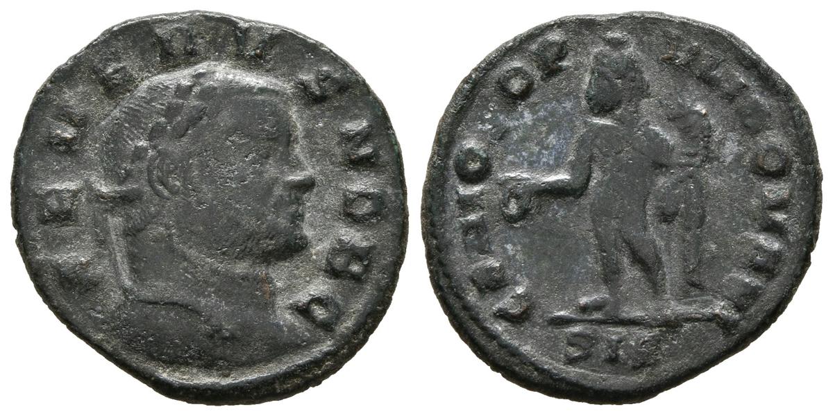 English SEVERE II. 1/4 of Follis. 305-306 AD Siscia. A / Laureate head to the right. FL VAL SEVERVS NOB C. R / Genius shelf on the left with chlamys carrying patera and cornucopia. GENIO POPVLI ROMANI, in exergue SIS. RIC 170a. Ae. 2.18g. VG.