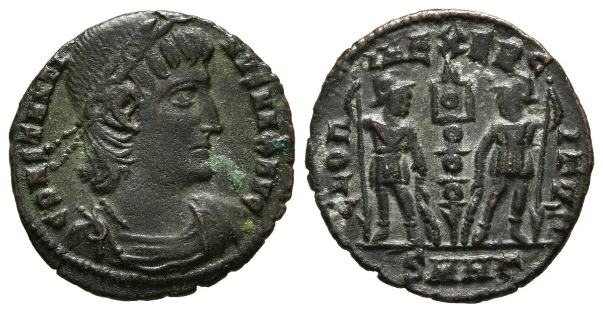English CONSTANTINE I. Follis. (Ae. 1.35g / 17mm). 330-335 AD Nicomedia. Anv: CONSTANTINVS MAX AVG. Laureate bust, draped and with cuirass to the right of Constantino I. Rev: GLORIA EXERCITVS. Two soldiers standing facing each other holding spears, including a banner, in exergue: SMNr. (RIC 188). VF.