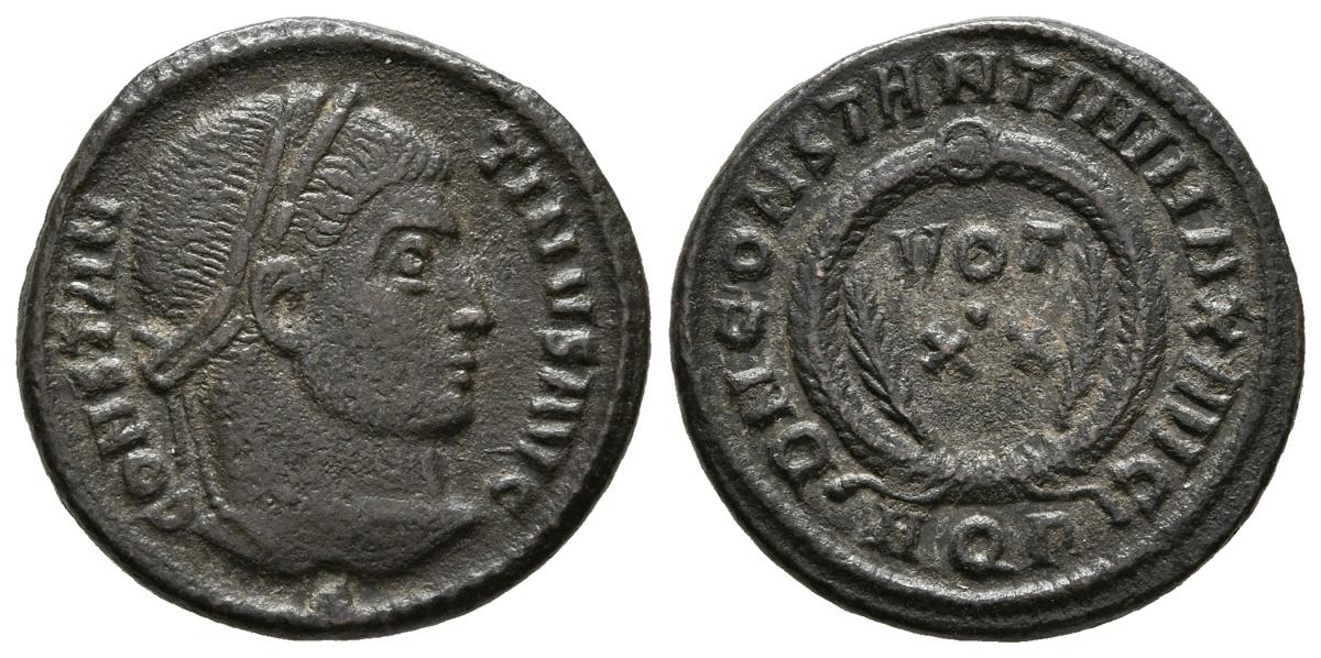 CONSTANTINE I. Follis. (Ae. 2.71g / 19mm). 322 AD Rome. Anv: CONSTANTINVS AVG. Laureate bust to the right of Constantine I. Rev: DN CONSTANTINI MAX AVG. VOT XX, inside laurea, below RQr. (RIC 245). F.