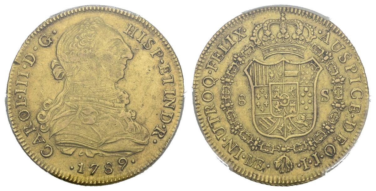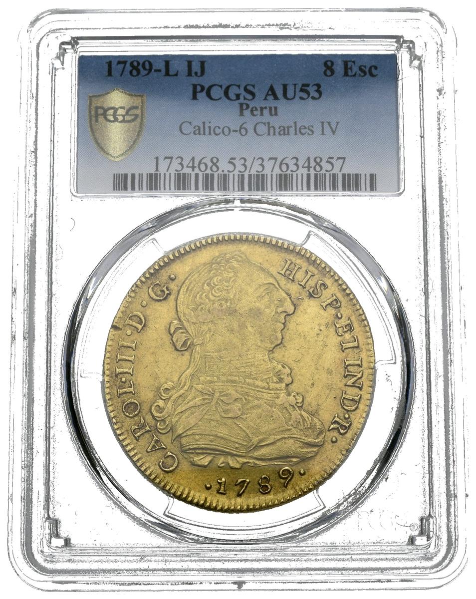 CHARLES III (1759-1788). 8 Shields. (Au. 27.00g / 36mm) *. 1789. Lima IJ. (Cal-2019-1954). XF. Encapsulated by PCGS AU53. * Theoretical weight.
