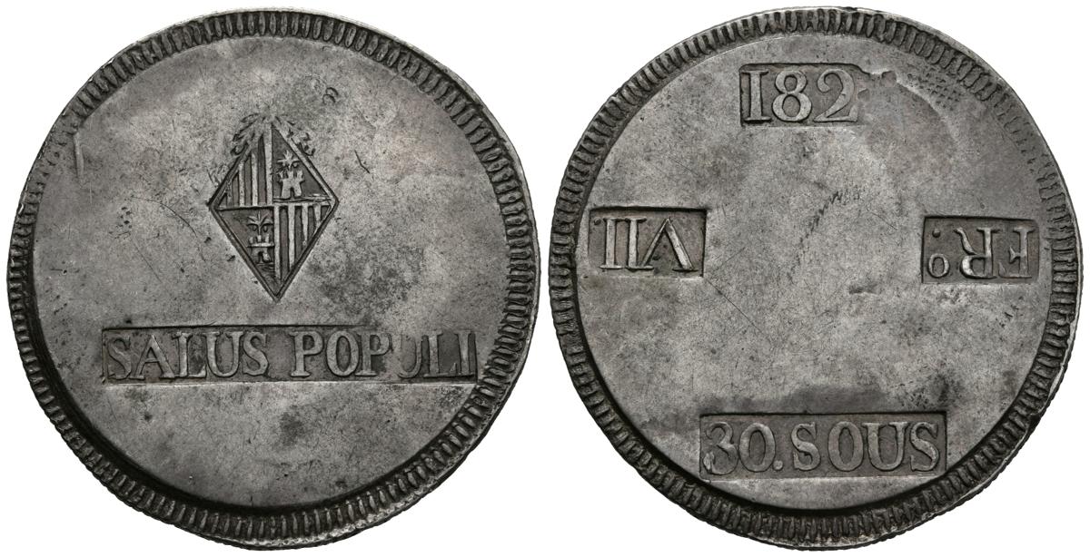 FERNANDO VII (1808-1833). 30 Sous. (Ar. 26.70g / 41mm). 1821. Mallorca. (Cal-2019-1295). Variant FRº / VII inverted. VF. Vain on obverse. Very rare and beautiful specimen.
