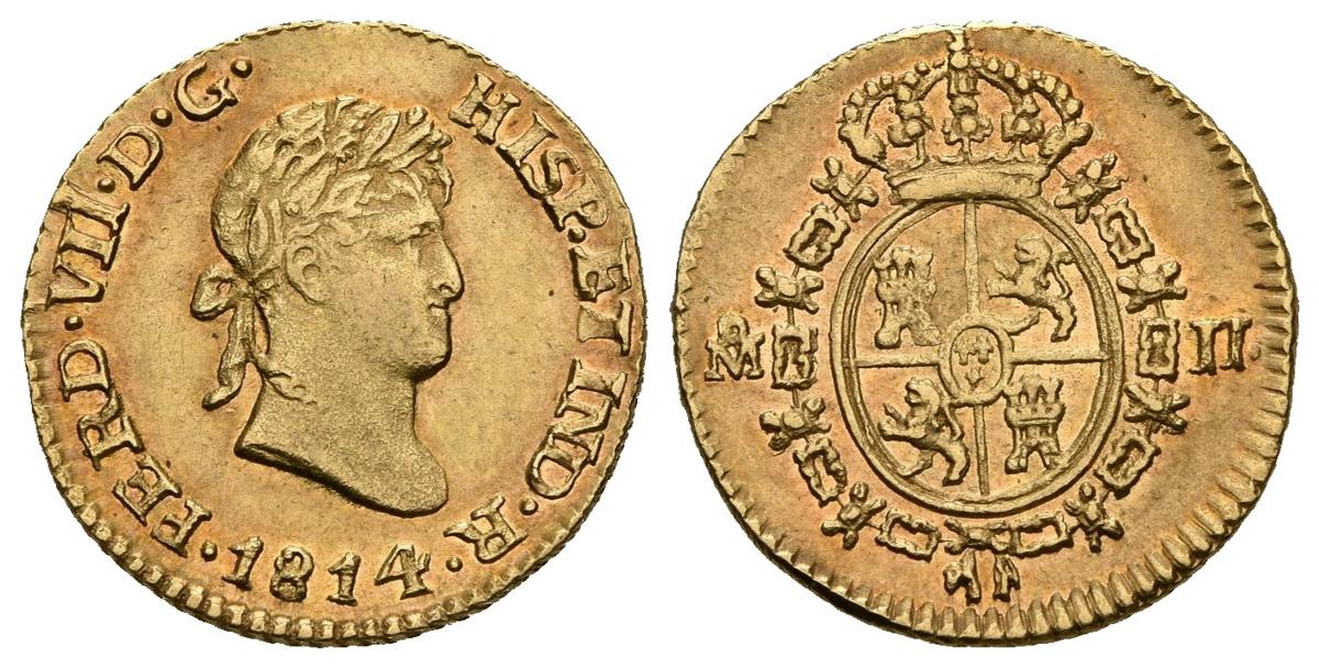 English FERNANDO VII (1808-1833). 1/2 Shield. (Au. 1.70g / 15mm). 1814. Mexico JJ. (Cal-2019-1487). AU. Original shine. Precious and rare specimen in this quality.