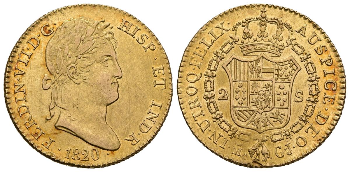FERNANDO VII (1808-1833). 2 Shields. (Au 6.76g / 22mm). 1820. Madrid CJ. (Cal-2019-1628). XF. Remnants of original shine.