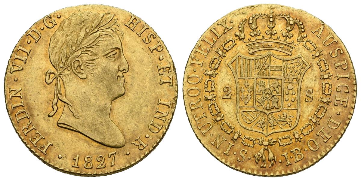 English FERNANDO VII (1808-1833). 2 Shields. (Au 6.78g / 21mm). 1827. Seville JB. (Cal-2019-1685). AU. Scarce as well.