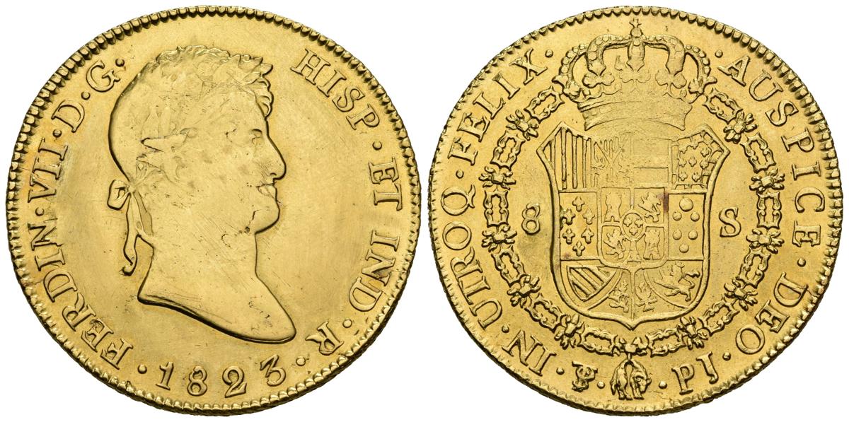 FERNANDO VII (1808-1833). 8 Shields. (Au. 26.91g / 36mm). 1823. Potosí PJ. (Cal-2019-1827). F/ VF. Cleaned.