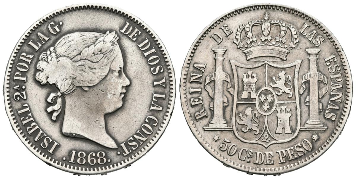 ISABEL II (1833-1868). 50 cents. (Ar. 12.85g / 29mm). 1868. Manila. (Cal-2019-667). VF. Nice tone.