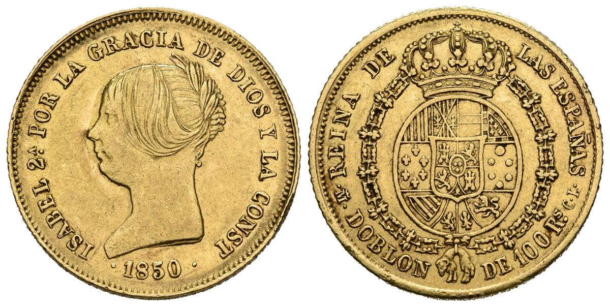 English ISABEL II (1833-1868). 100 Reais. (Au 8.15g / 22mm). 1850. Madrid CL. (Cal-2019-757). XF.