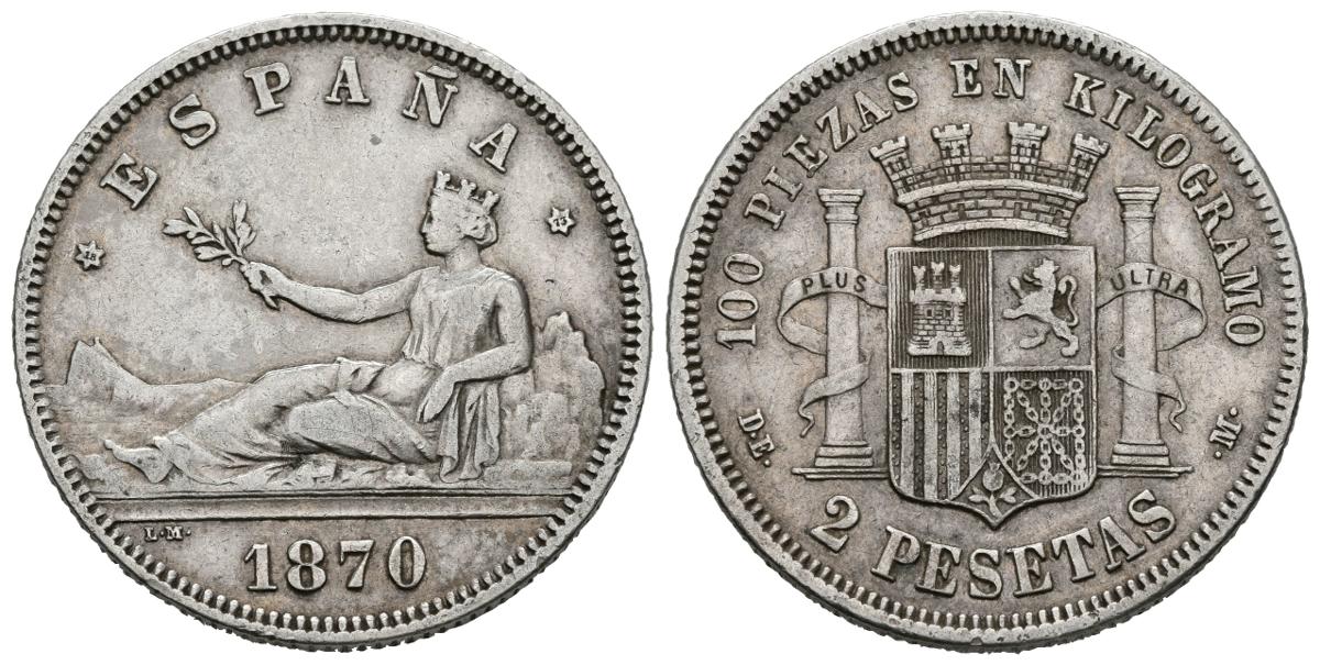PROVISIONAL GOVERNMENT (1868-1871). 2 Pesetas (Ar. 10.00g / 27mm). 1870. * 18-73. Madrid. DEM. (Cal-2019-28). VF.